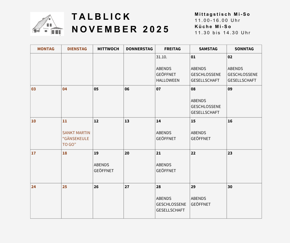 Neben dem Mittagstisch (Mi-So 11.00-16.00 Uhr) haben wir zusätzlich an folgenden Abenden im Oktober und November für Sie geöffnet: